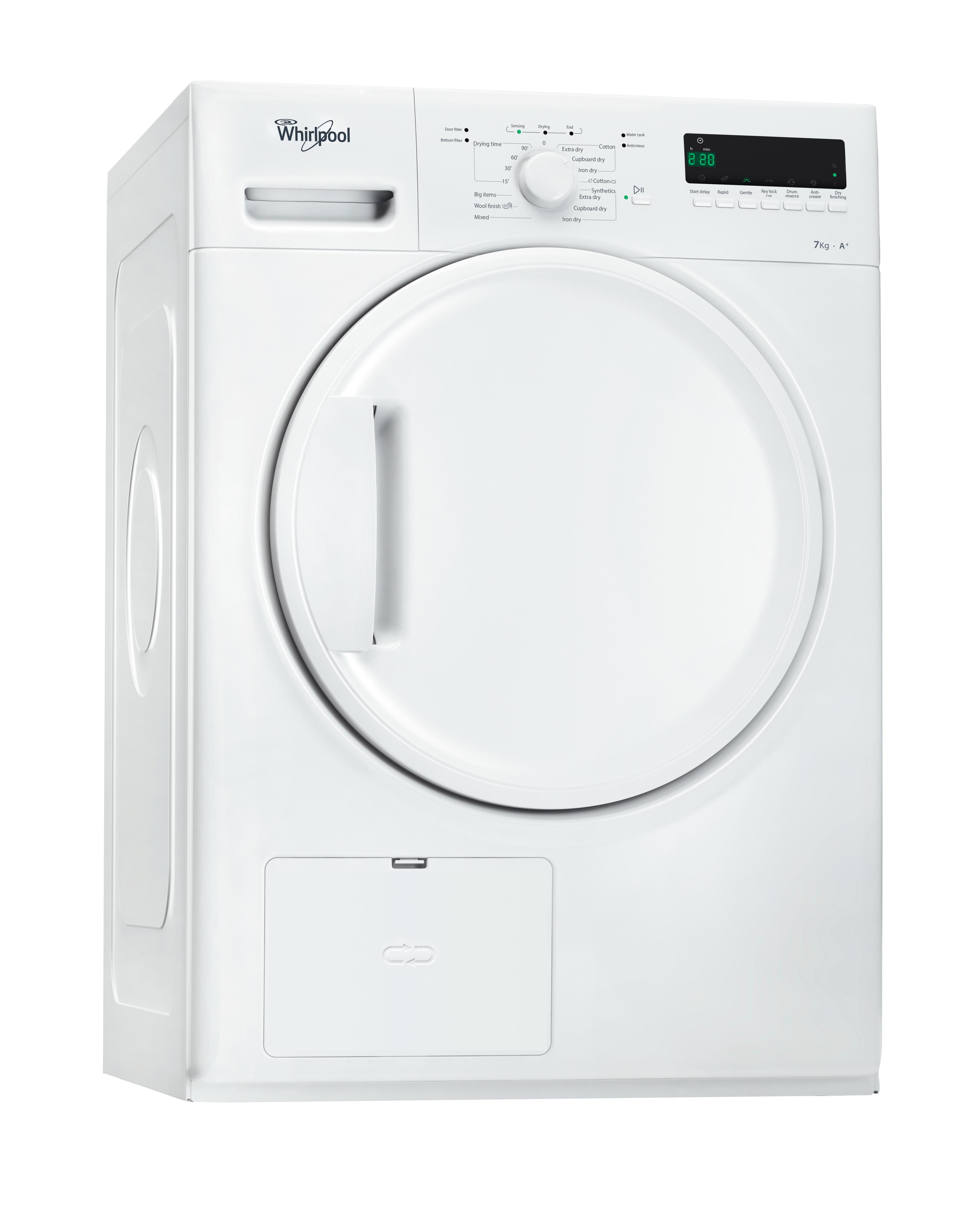 Denne fritstående Whirlpool-tørretumbler har: rummelig tromle med 7 kg kapacitet. Eksklusiv 6th SENSE-teknologi, som konstant overvåger fugtigheden i tromlen og derved beskytter dit tøj og giver perfekt tørreresultat. Varmepumpeteknologi, som effektivt genopvarmer luften i enheden og derved reducerer energiforbruget markant.